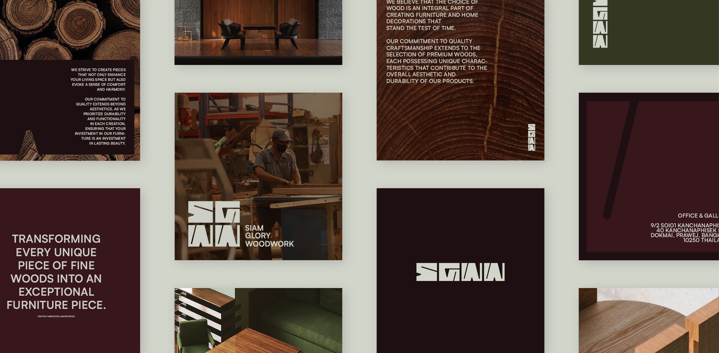 The visual identity, inspired by the process of making furniture, highlights how large hardwoods are turned into beautiful and functional pieces. The logo, featuring rectangles with cuts, reflects this transformation and embodies how wooden products can uplift emptiness to a warm atmosphere.